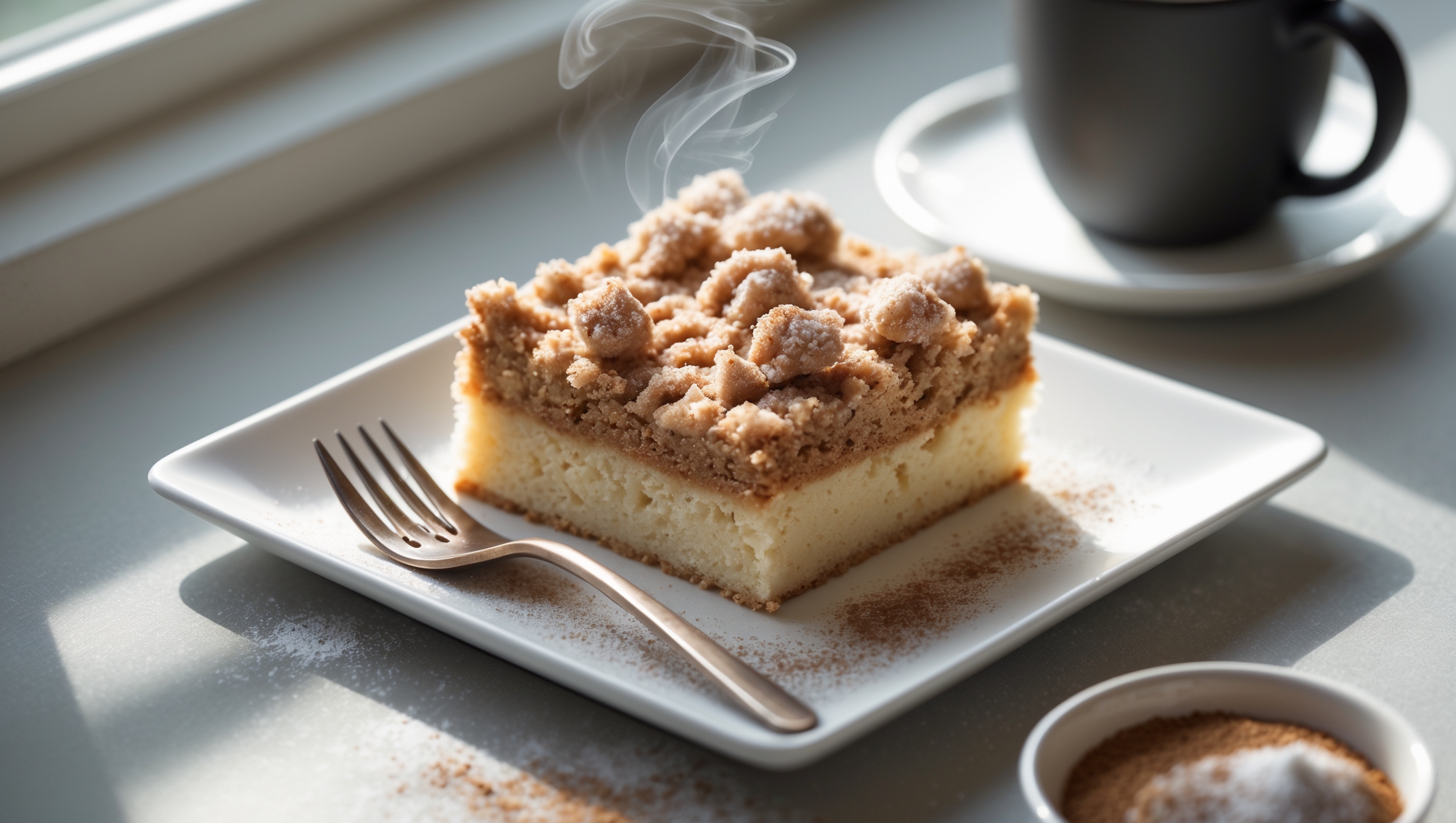 Despite its name, traditional coffee cake doesn't actually contain coffee as an ingredient. It's called "coffee cake" because it's designed to be enjoyed alongside a cup of coffee, complementing the beverage with its sweet, cinnamon flavours and contrasting textures.