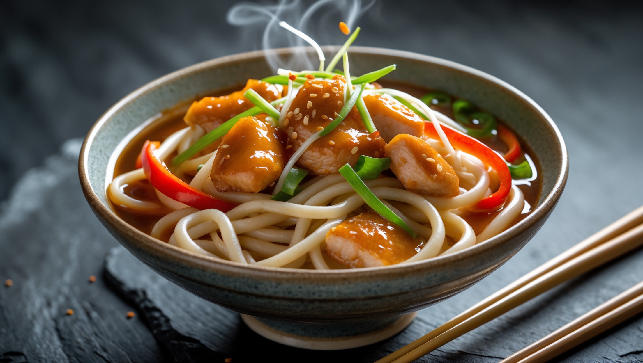 Learn how to cook Ginger Chicken Udon from {Restaurant Name} by first preparing udon noodles, then searing seasoned chicken pieces until golden. Stir-fry vegetables with ginger and garlic, create a soy-based sauce, combine everything together and garnish with spring onions and sesame seeds.